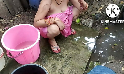 Indian house wifey bathing outside