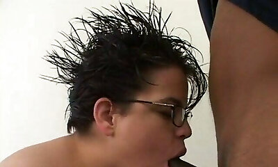 Chubby short haired schoolgirl with glasses gets black jizz-shotgun