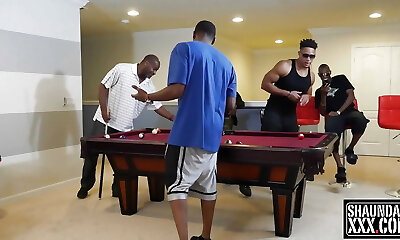 She surrounded by a few dark-hued penises and screams with joy when they penetrate all her holes simultaneously