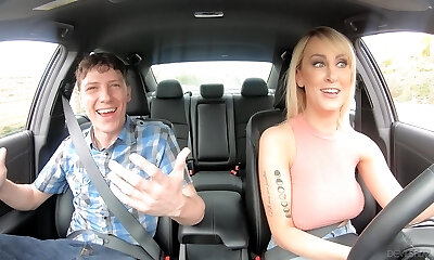 Blonde girl Angie Lynx deep throating a hard cock after washing a car